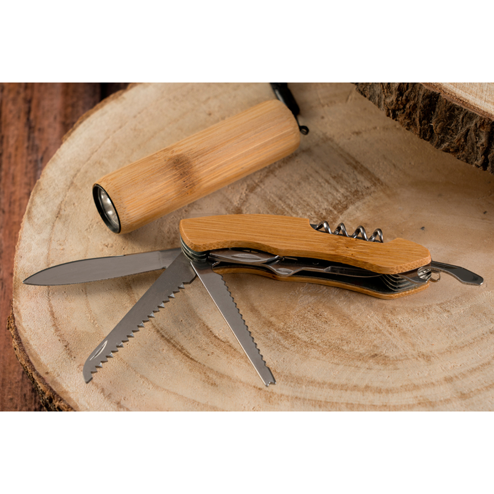Zestaw składający się z latarki w bambusowej obudowie, z baterią o mocy 500 mAh i scyzoryka.