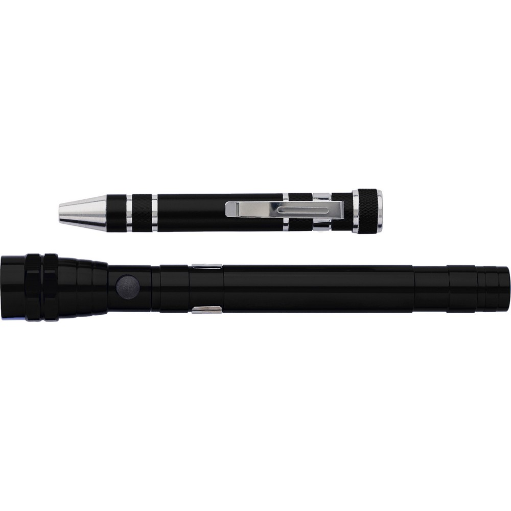 Zestaw narzędzi w pudełku, teleskopowa latarka 3 LED oraz śrubokręt w kształcie długopisu z 4 płaskimi i 4 krzyżakowymi końcówkami