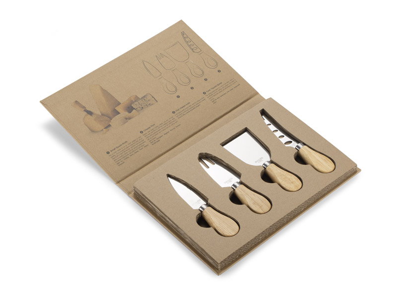 Zestaw 4 noży do sera zapakowany w klasyczne, porządnie wykonane papierowe pudełko.