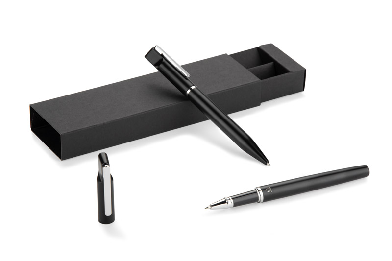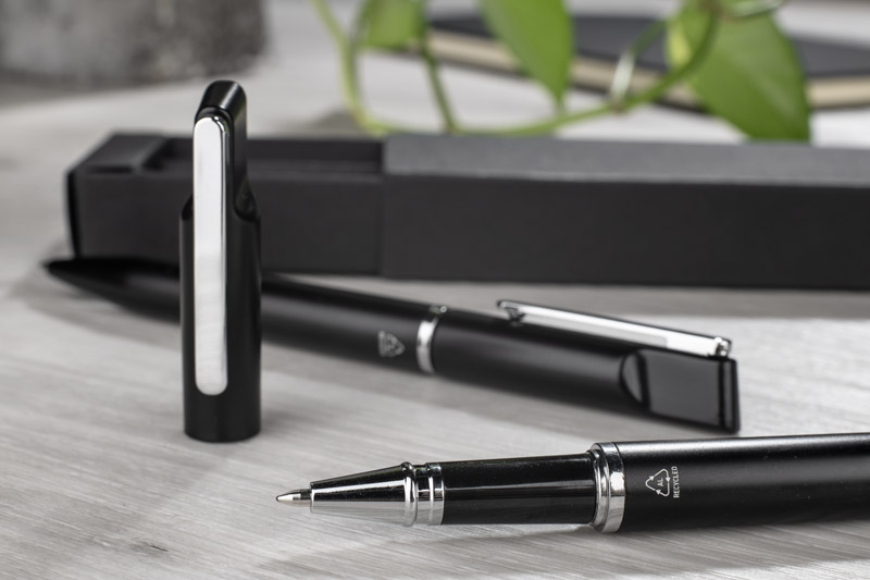 Zestaw piśmienniczy EFAN to stylowy komplet składający się z długopisu oraz pióra kulkowego, wykonanych z recyklingowanego aluminium.