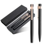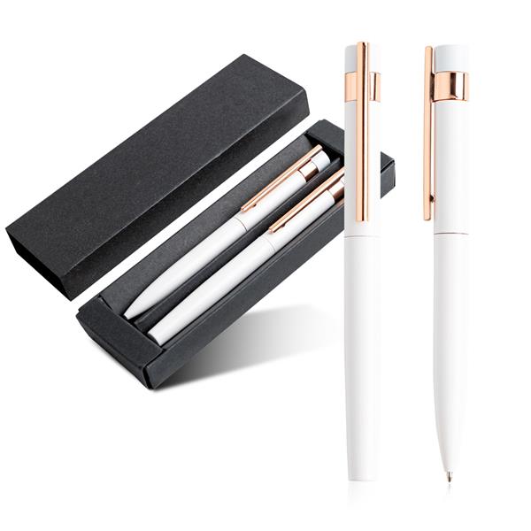 Zestaw piśmienniczy w czarnym kartoniku prezentowym wykończony elementami w kolorze rose gold, idealnie nadaje się do grawerowania.