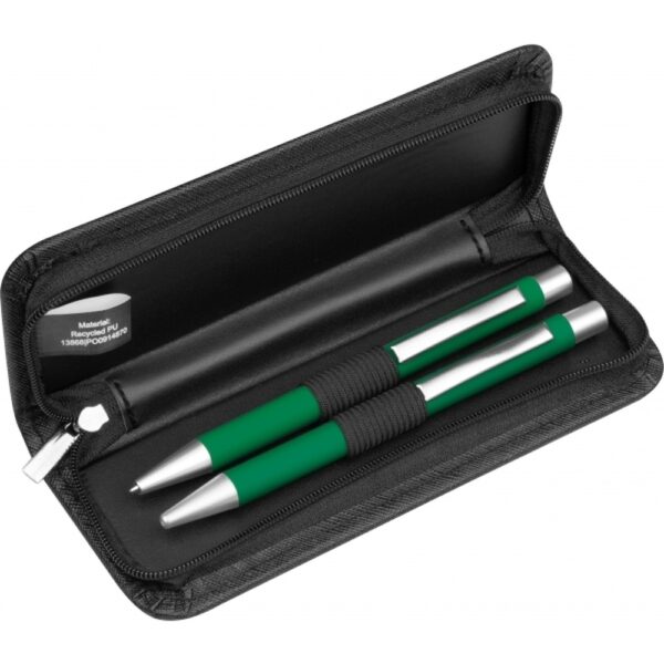 Elegancki zestaw piśmienny składający się z długopisu z niebieskim wkładem oraz precyzyjnego ołówka automatycznego to połączenie stylu i funkcjonalności, które doceni każdy wymagający użytkownik. Oba narzędzia zostały wykończone srebrnymi elementami, które podkreślają ich nowoczesny charakter, a miękka powłoka typu soft touch gwarantuje wygodny i pewny chwyt podczas długotrwałego pisania. Zestaw jest zapakowany w starannie wykonane etui z ekologicznego materiału PU pochodzącego z recyklingu, zamykane na zamek, co zapewnia bezpieczne przechowywanie i łatwy transport.