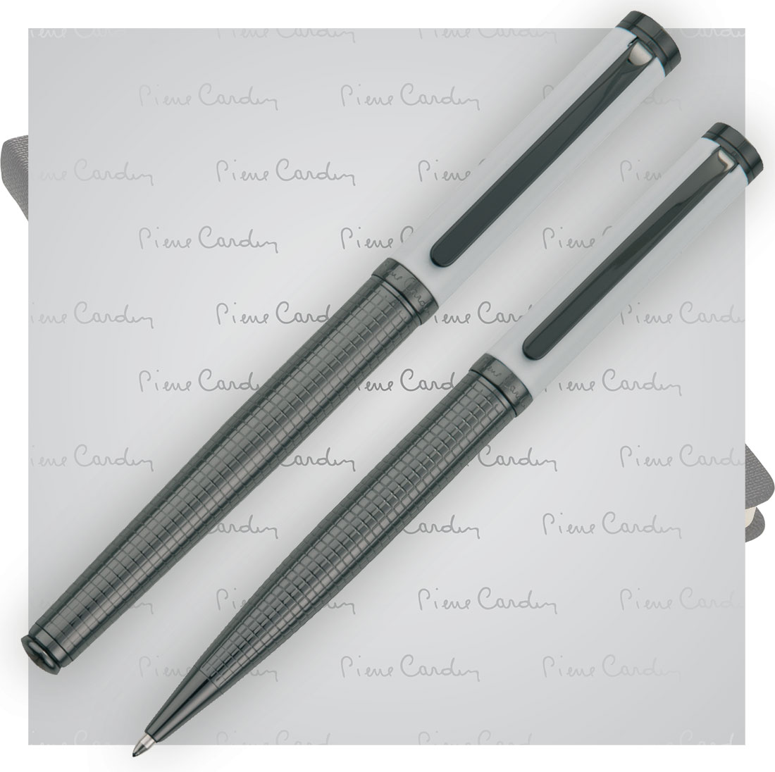 Szykowny, dwukolorowy Zestaw piśmienniczy składający sie z długopisu i pióra kulkowego. Długopis wyposażony w wysokiej jakości niebieski wkład z końcówką 1 mm, a pióro w niemiecki wkład Schmidt® piszący na niebiesko z końcówką 0,6 mm. Obydwa artykuły w zestawie z czarnymi wkładami zapasowymi. Całość zapakowana w eleganckie pudełko prezentowe z certyfikatem autentyczności Pierre Cardin.