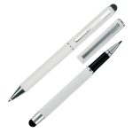 Luksusowy Zestaw piśmienniczy składający się z długopisu i pióra kulkowego wykonanych z aluminium, z przyjemną w dotyku powierzchnią soft touch i srebrnymi detalami.