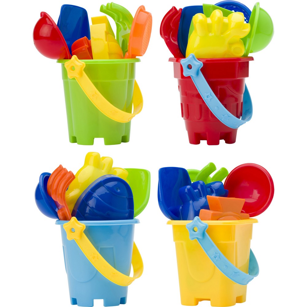 Wiaderko plażowe w 4 różnych kolorach i kształtach - 2 okrągłe, 1 kwadrat, 1 ośmiobok, wewnątrz znajdują się: łopatka, grabki, sitko, szufelka i 2 foremki do piasku (krab i ryba), mix 4 wzorów