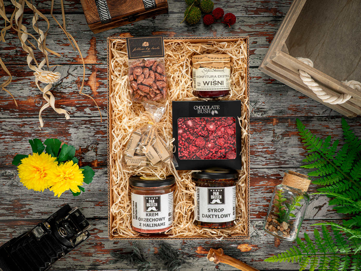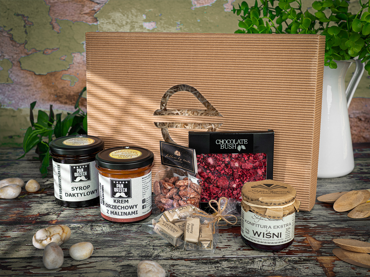 W przypadku braku dostępności produktów z oferty zastrzegamy sobie prawo do zamiany produktów na równowartościowe; zawsze po wcześniejszej akceptacji przez Klienta.Owocowy raj to paczka pełna naturalnych smaków, idealna dla smakoszy! Zawiera konfiturę extra z wiśni (200 g), mleczną czekoladę z liofilizowanymi malinami (85 g), syrop daktylowy (400 g), krem orzechowy z malinami (300 g), miodowe krówki (70 g) oraz prażone orzechy nerkowca (70 g). Całość zapakowana w eleganckie opakowanie, gotowa na prezent lub do delektowania się!