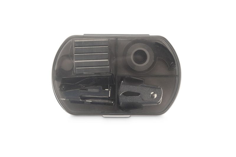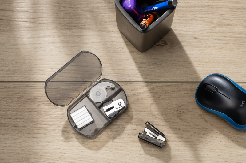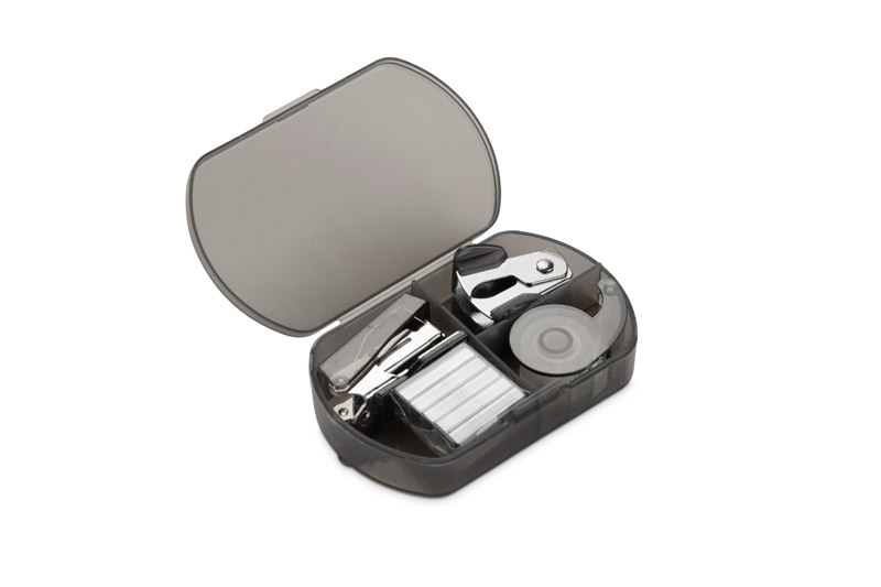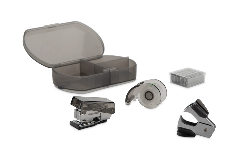 Zestaw biurowy DOCSY to kompaktowe rozwiązanie zawierające najpotrzebniejsze akcesoria: mini zszywacz, mini dziurkacz, taśmę klejącą oraz zapas zszywek – wszystko zamknięte w poręcznym etui z tworzywa.