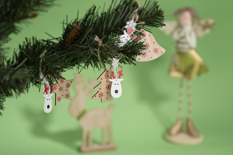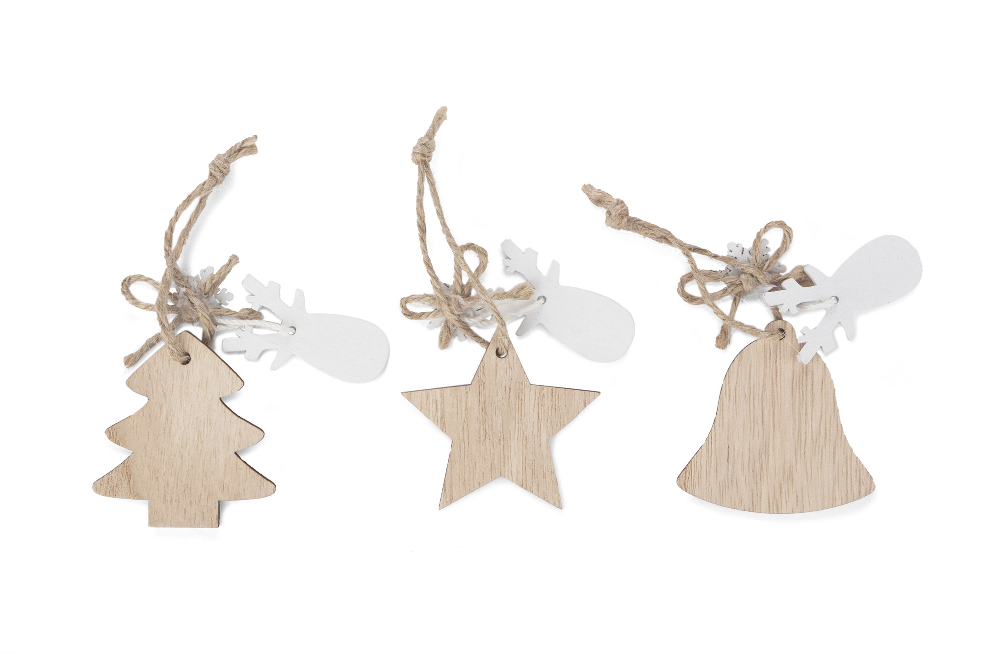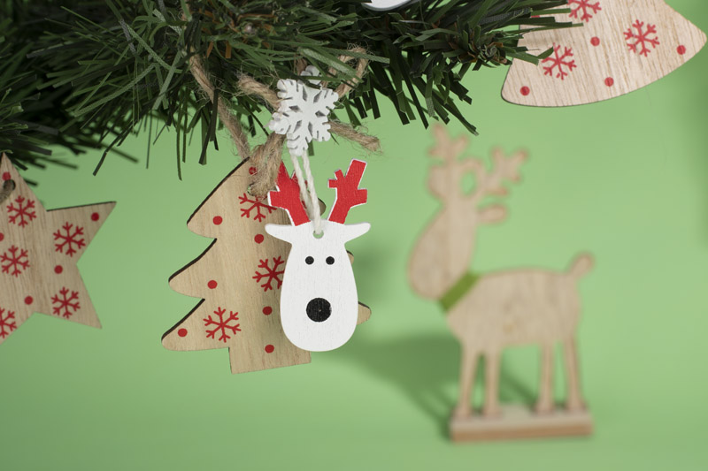 Zestaw FERI składa się z 3 sztuk drewnianych zawieszek o różnych wzorach: gwiazdka, choinka, dzwoneczek.